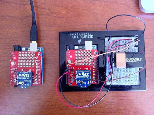 Before I shot off to Home Depot, a quick perusal of my electronic kit bag turned up a 9V power adapter. Now Arduinos work swimmingly with inputs anywhere between 7V and 12V, so a 9V connected to VIN and GND would do the trick nicely. So at Home Depot I picked up a tiny USB hub and some 9V batteries. See previous post on why I needed a USB hub. Hooking everything up gave me what you see in the above picture. With PhysicalPixel running on the left, and a modified StateChangeDetection running on the right, I was able to send ‘H’, ‘L’ from the right Arduino to the left Arduino upon pressing a switch connected to GPIO2. The on-board LED on Arduino on the left would turn on and off in response to these ‘H’s and ‘L’s. This is what is called success, I now had two Arduinos talking to each other without the intervention of the mother computer. It was time for them to fly, but before they could fly, I needed to upgrade their OS’s. I wanted something a little more communicative and inter-operable than the Arduino sketch language – it was time to introduce Node.js. See the upcoming post on Arduino, XBee and Node.js for more fun and frivolity.