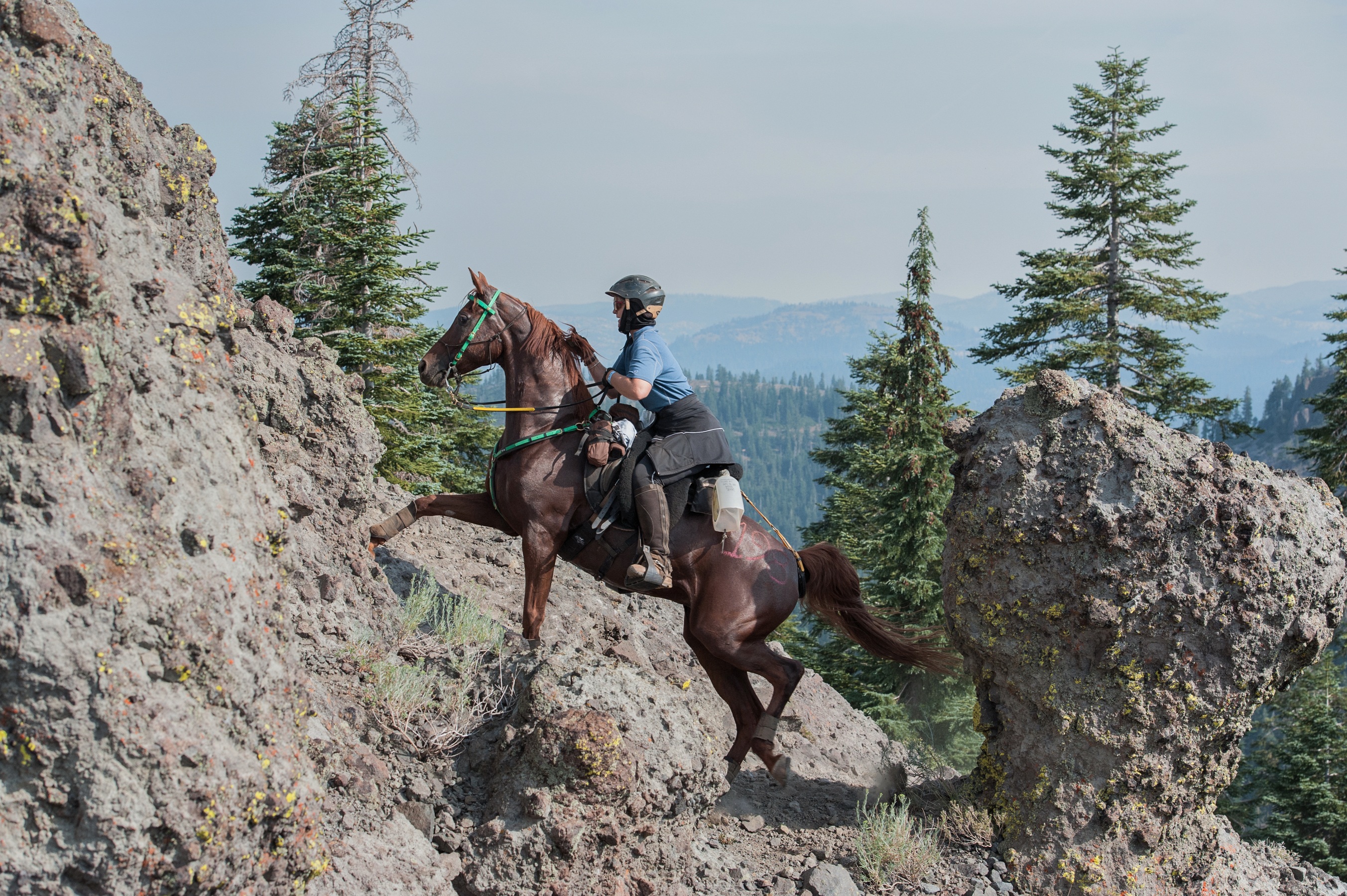 10:30am: I arrive at Foresthill and park the rig in a place I had blocked off with yellow caution tape and crew member cars the day before. I’ve crewed a few times for other people at Foresthill and know that finding and keeping a spot close to the veterinarian area where the horses come in very important to having a successful stop here. 3 times I have to fend off other crews while they try to cross my caution tape or block the entrance to our crew area. It’s the wild west, and anything goes. If you don’t stand up and fight, you’ll be run right over and lose your spot. There is no officiating of any kind or enforcement of the “rules”, so it’s each team for themselves here. It’s about this time that I expect Cindy to be either going up, or going around the infamous Cougar Rock. Going up it is optional, but if you have the guts, it makes for the quintessential Tevis picture. As I found out later (obvious from the pictures below) she went up it in fine style.